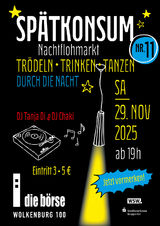 Lasst uns am Samstag, 29. November wieder durch die Nacht trödeln, trinken und tanzen - beim SPÄTKONSUM in der börse ab 19 Uhr.